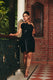 A striking black one-piece gown crafted in textured fabric, featuring a sculpted corset-style bodice adorned with floral embellishments and a sleek, straight-cut silhouette for an elegant finish.