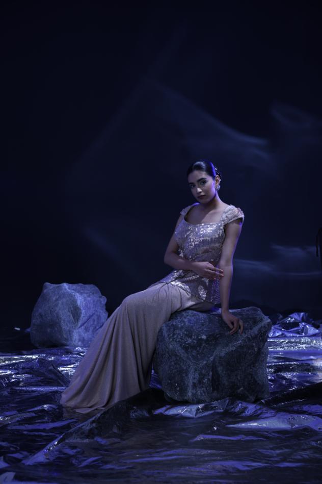 Metallic lycra & Champagne,  Blush gold embroidered corset with draped skirt